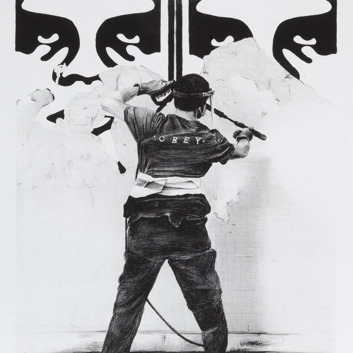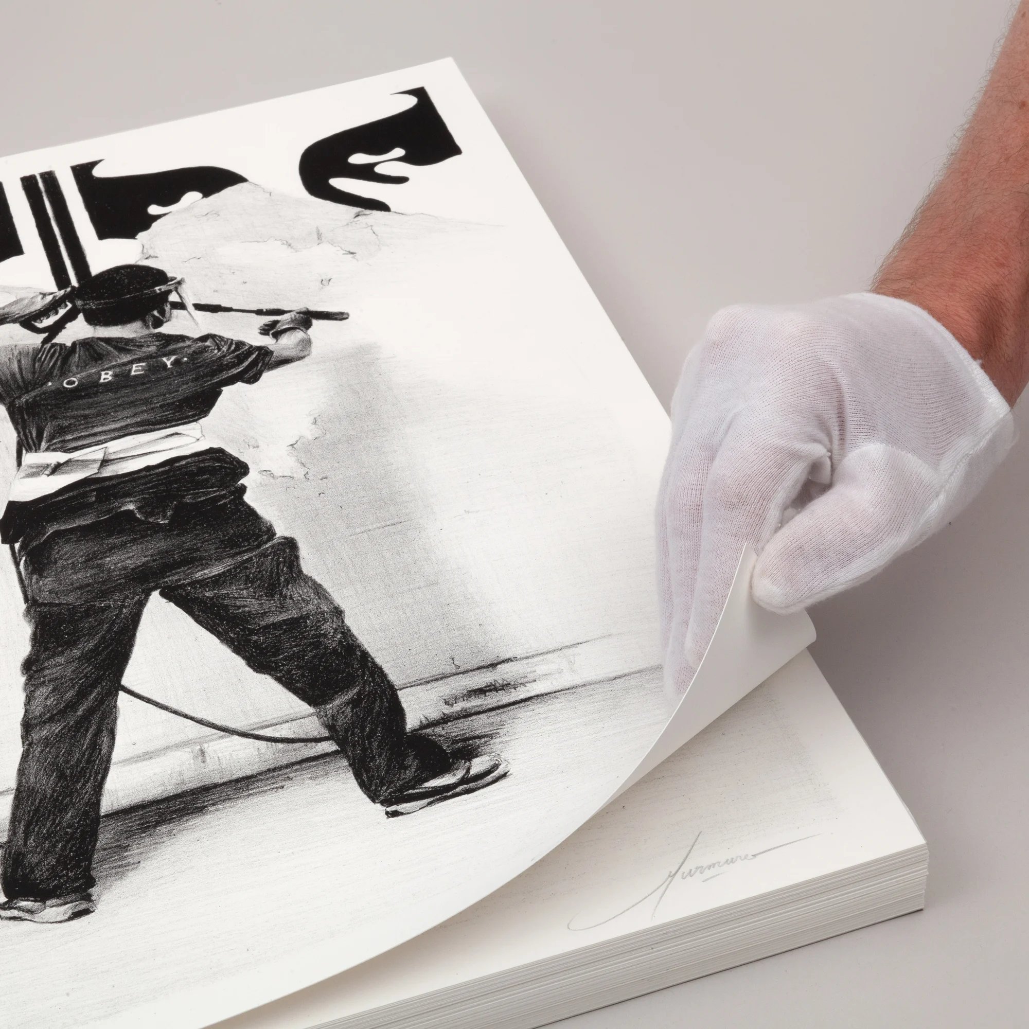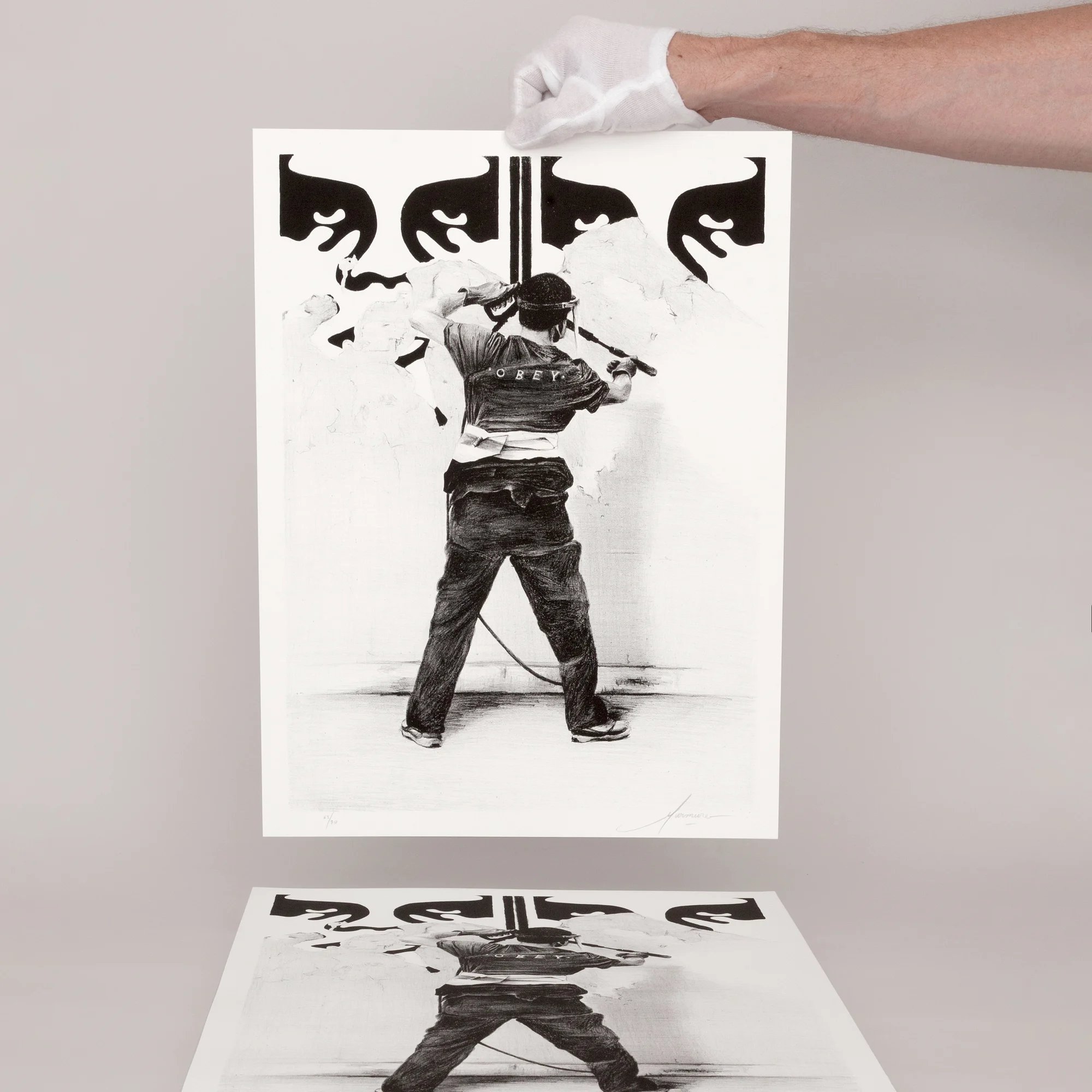 "Obey!" is a fine art stone lithograph printed on BFK Rives 250g white paper, known for its rich texture and durability. Each print is using traditional lithographic techniques, ensuring high-quality detail and depth. This limited edition of 70 is individually signed and numbered by the artists and comes with a certificate of authenticity.